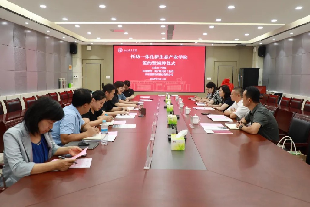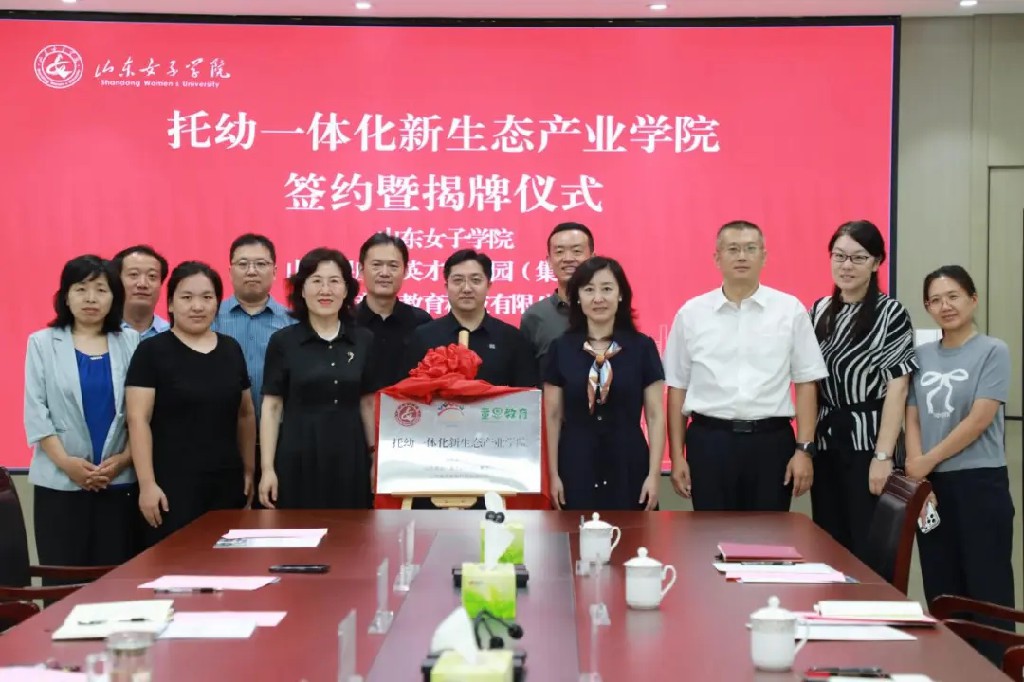 袁霞與山東女子學院教育學院院長王飛簽訂托幼一體化新生態產業學院合作協議書。隨后,合作各方領導共同為“托幼一體化新生態產業學院”揭牌。